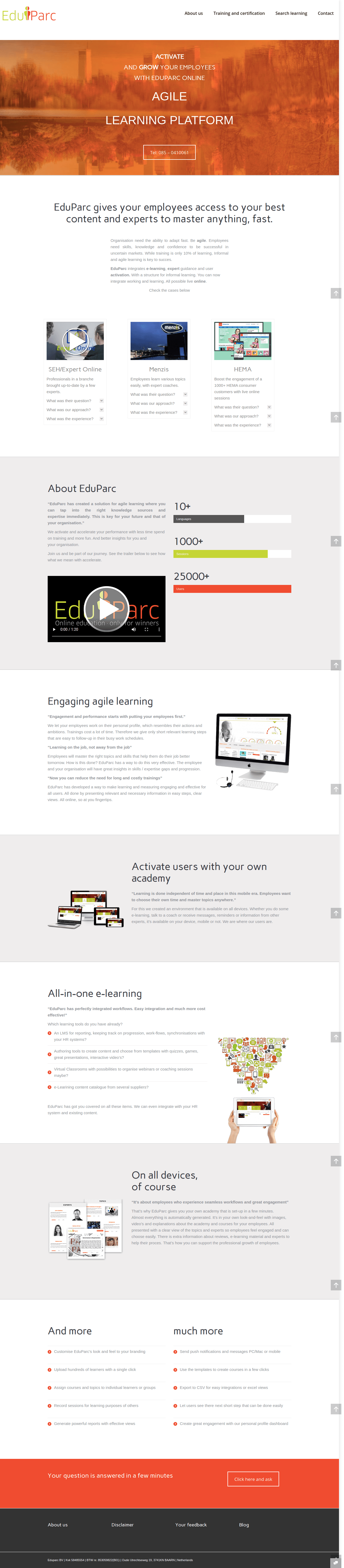 Organization need the ability to adapt fast. Be agile. Employees need skills, knowledge and confidence to be successful in uncertain markets. While training is only 10% of learning. Informal and agile learning is key to success. EduParc integrates e-learning, expert guidance and user activation. With a structure for informal learning. You can now integrate working and learning. All possible live online.
