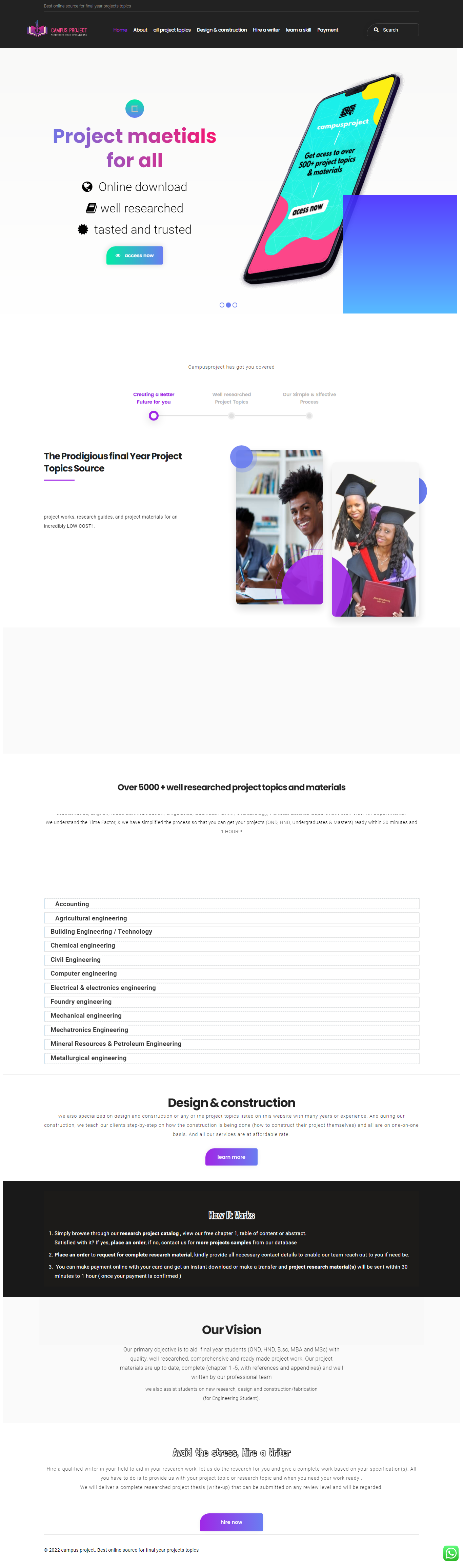 Students a portal where they can get their project materials without hassles. Campusproject is a university project materials portal, key to student's success. Campusproject integrates e-learning, expert guidance and automatic download. with just a click, you can get access to thousands of project materials. All possible live online.