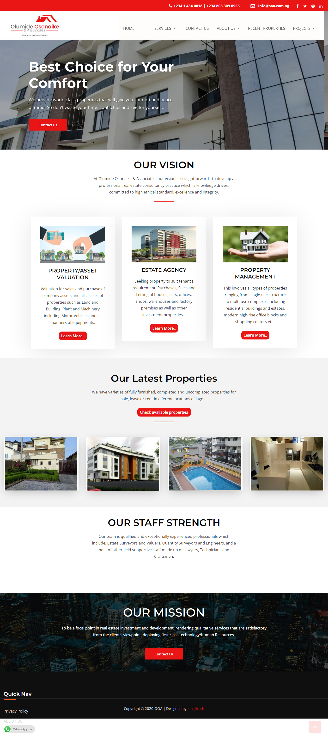 OLUMIDE OSONAIKE & ASSOCIATES ( www.ooa.com.ng) is a Nigerian/ African leading real estate agency. they are an Indigenous firm of Estate Surveyors and Valuers registered in Nigeria as a business concern and recognized by the Estate Surveyors and Valuers Registration Board of Nigeria (ESVABON), to practice the profession of Estate Surveying and Valuation throughout the Federation.